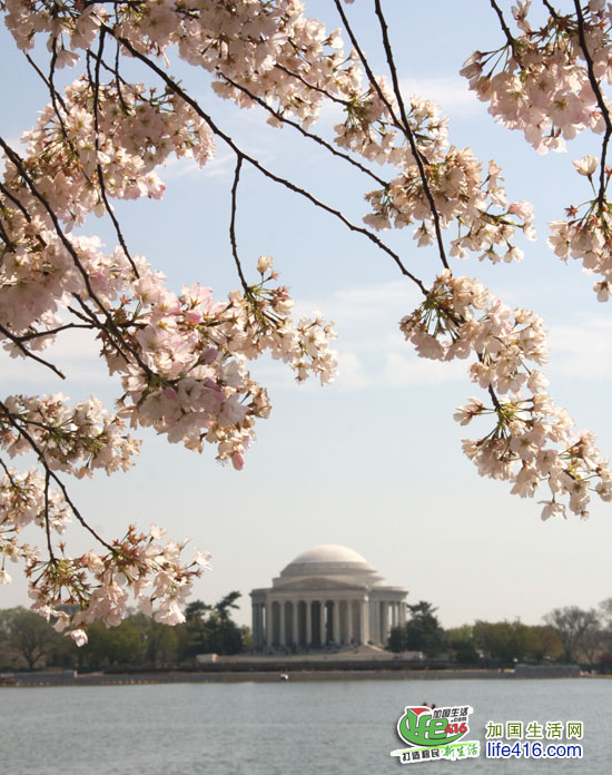 从这个角度拍林肯纪念堂,这应该樱花树下的最经典的照片。