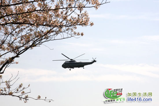 樱花树旁怎么会有直升飞机?这是美国警察在巡逻,华盛顿的警察最牛X,巡逻都不开警车了,直接开直升飞机。