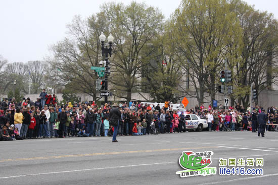 4月9日,华盛顿的天阴阴的,据当地新闻报道说,星期六的气温和最近几天温度最低的一天,也就15摄氏度左右。樱花大游行是在当地时间上午10点举行,地点是在Constitution Ave。上午9点左右,当小编和老公从酒店坐地铁到达游行地点的时候,地铁里全是一年老少前来看游行的人们。