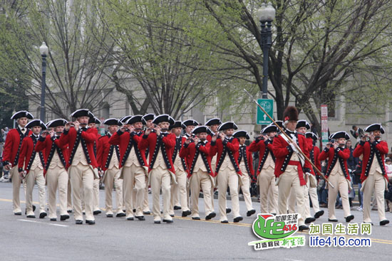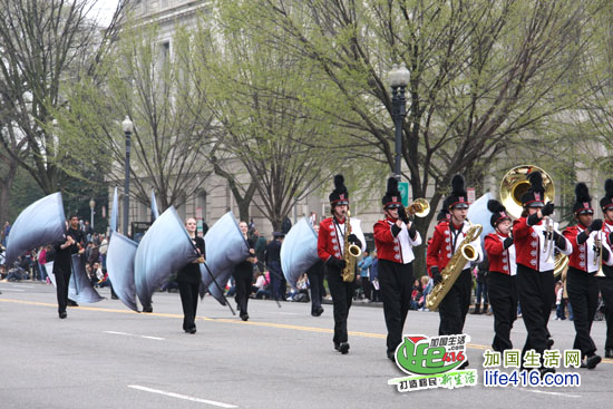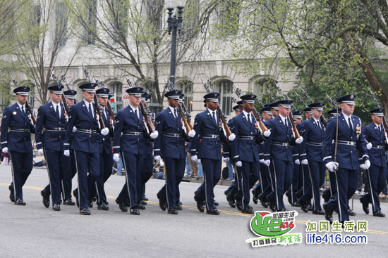 接着走来的是美国海陆空三军仪仗队和军乐队,随着仪仗队一个一个走过,道路两边响起了热烈的掌声,一些华盛顿人高喊“Thank you”,以感谢这些军人的保家卫国。