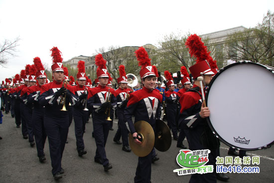 不光是观众,连游行队伍的学生们也跟着在看,有些还边唱边跳。