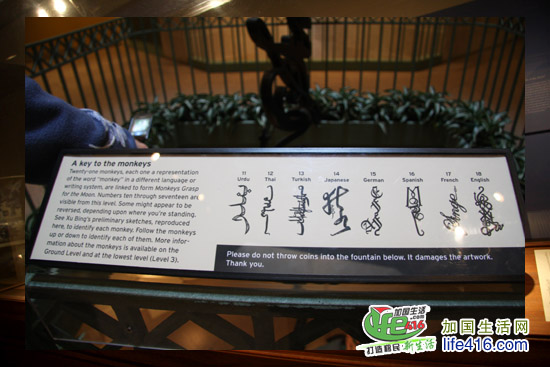 看说明,这些是符号也是“文字”哟,是将不同的语言用书法的形式来写“猴子”,总共有21种语言,也就是说有21只猴子。这些猴子连在一起,形成一幅“猴子捞月”的图案,很有创意。