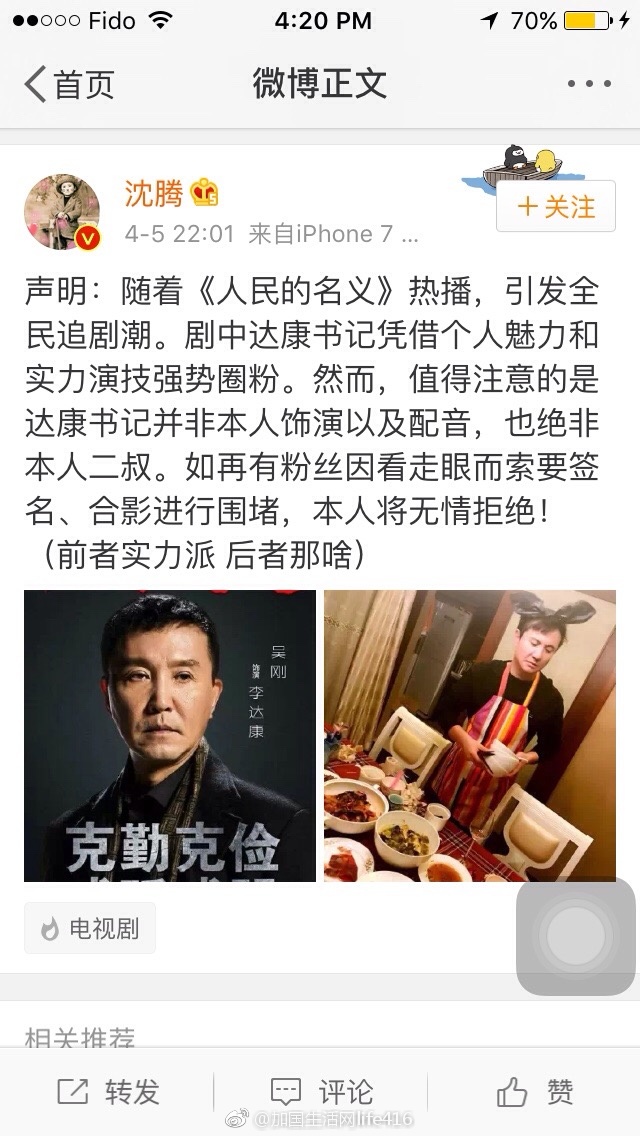 《人民的名义》火了“达康书记”火了 连带沈腾发表“声明”