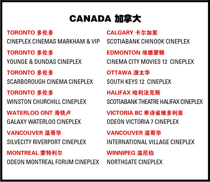 全加拿大多伦多、温哥华、维多利亚、蒙特利尔、卡尔加里、埃德蒙顿、渥太华、哈利法克斯、温尼伯均有放映这部电影,而大多伦多地区的放映这部电影的地点从之前的2个变成4个,即: