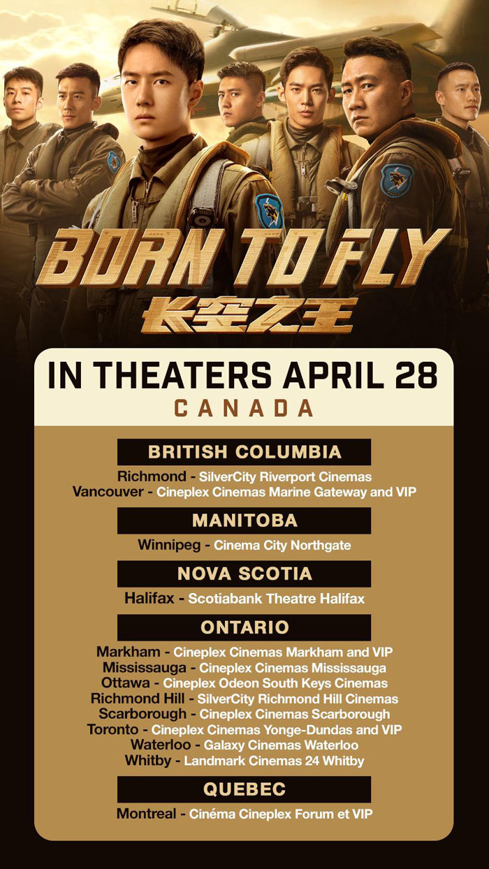 加国生活网小编最新爆料:电影《长空之王》(Born To Fly)即将在2023年4月28日(五)中国内地、美国、加拿大同步上映!加拿大上映电影院列表新鲜出炉,想看这部电影的朋友们不要错过哟!!