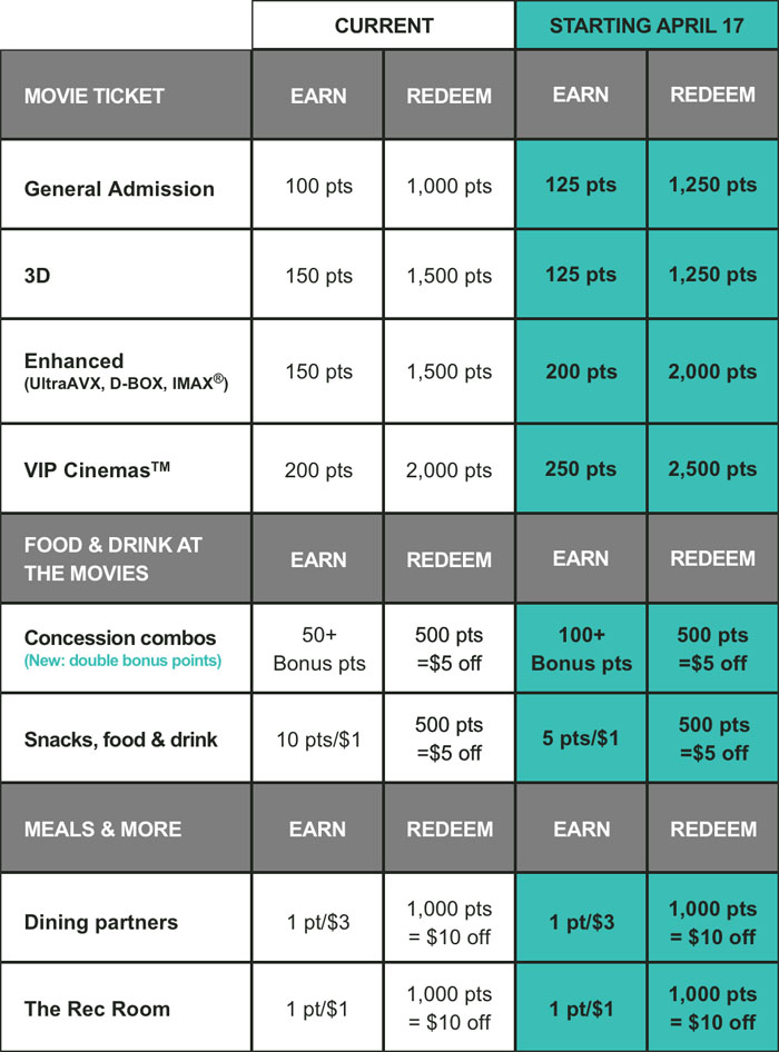 3、以往在电影院购买食物或饮料,每花$1能积10点、每500点能抵值$5(即花$50能换$5),而新奖励政策则变为每花$1能积5点,每500点能抵值$5(即花$100能换$5)