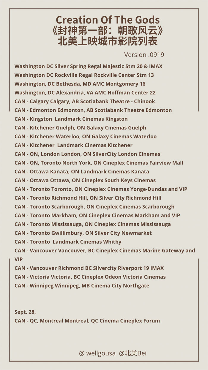 【加国生活网】Well Go USA荣幸向媒体朋友和影迷们宣布,电影《封神第一部:朝歌风云》(Creation Of The Gods I:Kingdom Of Storms)美国、加拿大 IMax版将于2023年9月20日及21日超前首映两天,9月22日(周五)全北美正式全面上映!
