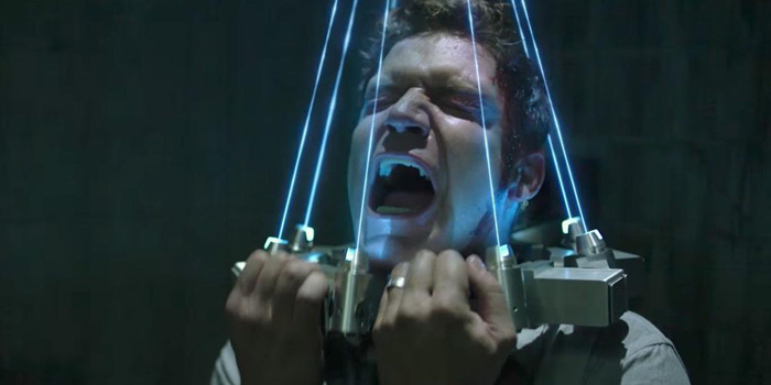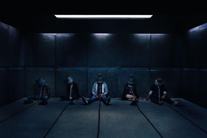 五位男女坐在地上,金属制水桶倒盖在头上,脖子被绑上金属链条,连接到对面嵌有多个圈型电锯的墙上。当五人逐渐醒来,一个低沉平静的男性嗓音从广播器中传出,告诉五人这是一场游戏,随即铁链开始转动,硬是把五人往电锯墙拉。Laura Vandervoort饰演的Anna急中生智,让电锯割伤手臂染血刀面,金属链条立即停止转动。Anna马上告诉其他受害者,阻止了其中三位受害者受伤。
