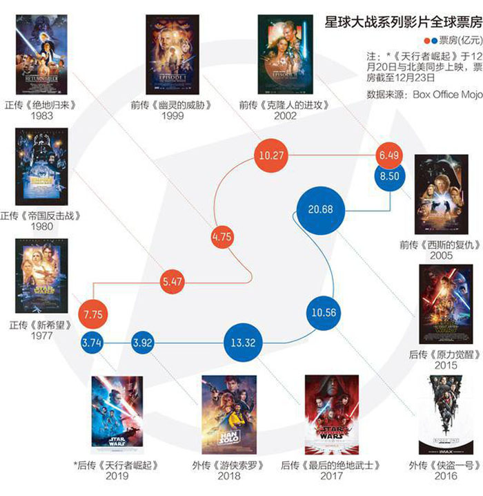 华特迪士尼公司于2012年收购卢卡斯影业后,同时宣布了《星球大战》后传三部曲电影的计划。2015年圣诞档,由J.J. Abrams执导的《星球大战7:原力觉醒》以近2.5亿美元的开画成绩震惊世人,最终更成功打破《阿凡达》保持的北美影史纪录,成为北美影史唯一票房破9亿美元的影片。两年之后的同样档期,由莱恩·约翰逊执导的续集《星球大战:最后的绝地武士》又再一次称霸圣诞档,只是其票房成绩相比《原力觉醒》大打折扣,而且评价也显得两极分化。上周末,“星战”IP的最新作品《星球大战:天行者崛起》正式开画,试图为迪士尼破纪录的年份画上一个完美的句号。
