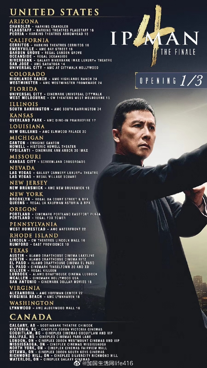 加国生活网编者按:《叶问4》自从圣诞期间在加拿大上映以来,场场火爆,Cineplex电影院又增加了一些上映电影院,具体电影院见下图(具体上映时间请点击这里查询)。小编观后感,《叶问4》确实是部好电影,朴实之中见真情,真情之中显霸气。华人在海外生存不易,要想获得尊重就要靠实力说话。叶问威武!中华武术威武!