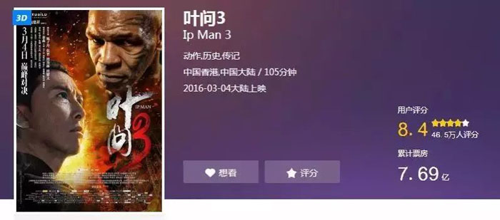 三部作品总票房超过10亿人民币,其中的《叶问3》就拿下了7.69亿票房佳绩。