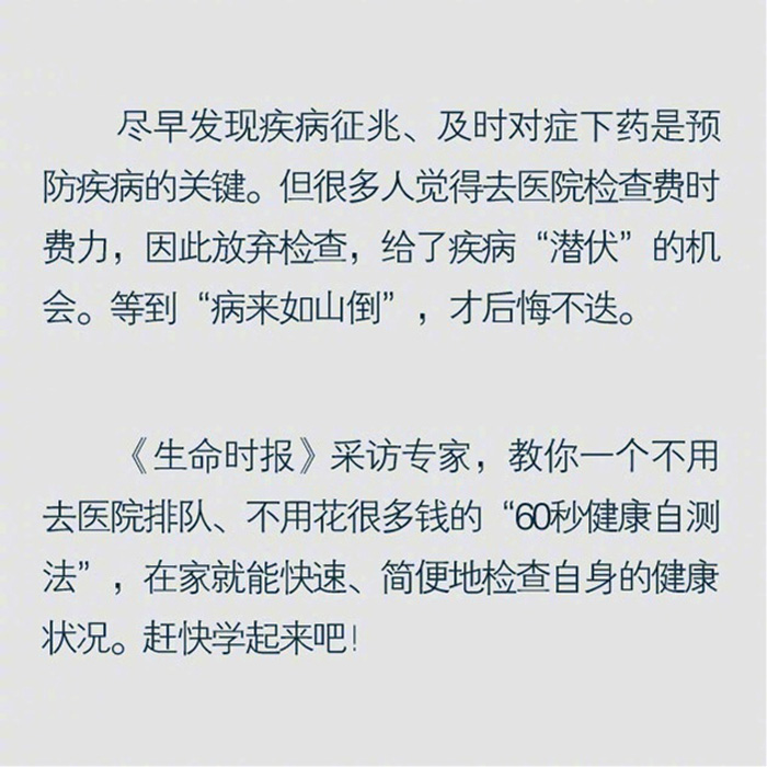 去医院检查费时费力?生命君教你一个在家就能用的“60秒健康自测法”:①一张白纸测甲亢;②餐勺刮舌测口臭;③画钟表测老痴;④巧用门框测视力;⑤绕椅行走测平衡力;⑥抬腿测血管堵塞;⑦双脚打拍子测心率。一起测测健康。