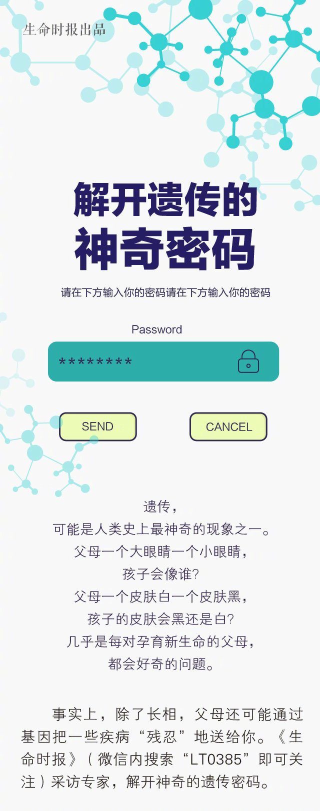 父母一个大眼睛一个小眼睛,孩子会像谁?父母的皮肤一个白一个黑,孩子的皮肤会黑还是白?遗传,可能是人类史上最神奇的现象之一。其实除了长相,父母还可能通过基因把一些疾病“残忍”地送给你。