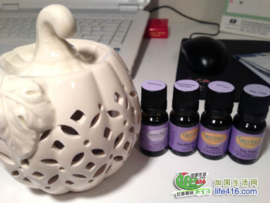 在感冒流行季节,大家可以使用一些精油来杀菌防感冒,保护家人健康。配方是:茶树(强大的空气杀菌剂,呼吸道消炎)+尤加利(缓解呼吸道各种症状:鼻塞、支气管炎、咳嗽、喉咙痛)+甜橙或柠檬(果香调和药味)。香薰炉是在Bath & Body Works买的,$10一个。有两种方法来使用精油,一种是使用香薰的方法,把三种精油各滴10滴在香薰炉中(香薰炉的小碗里加些水),下面洞洞里放上蜡烛,通过加热的方式,让精油散发出来。还有一种方法是80ml纯净水+15滴茶树+10滴尤加利+10滴甜橙,摇晃均匀后,喷在空气中,做为空气清新剂。如果你想买精油,欢迎参加小编组织的精油拼邮团,详情请点击这里。