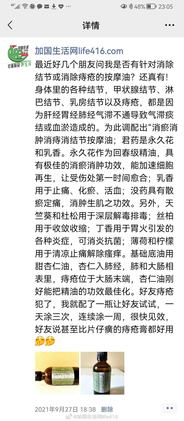 2022年10月14日:前段时间我耳眼靠近入口位置长了个疖子,不能戴耳机一戴就磨得疼,前几天挠了几下,竟把那里挠破了,弄得一手血还不停挺吓人的,问题是那个位置偏看不到,必须用镜子照才能看到,于是我用酒精消毒后,直接在手指头滴了2滴永久花精油,用手指涂到了耳眼儿那里,神奇的是那里很快就止血了。更神奇的是,第二天耳眼那里竟然平整了,那个疖子基本消肿了,出血的位置也结疤了,随后几天我每天涂1滴永久花精油,今天再一探查连血痂都变小了。我再次感受到永久花精油神奇的消瘀血消肿的功效,真是太赞了👍 ,怪不得永久花作为主力精油,用在消除痔疮上面也是效果刚刚的。事实上,我已经收到好几个痔疮按摩油的口头反馈了,效果真的很好,不仅消肿很快很舒服,竟然还在渐渐变小[笑cry][笑cry]。第76批拼邮已经开团啦,欢迎加入。