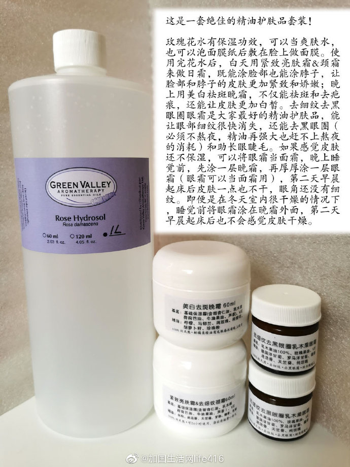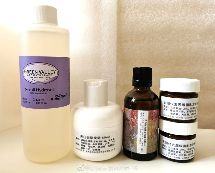 这一套是美白系列,包括:橙花花水可以做爽肤水和面膜能美白瘦脸消水肿、美白祛斑晚霜、美白祛斑精华按摩油可以配合刮痧按摩、去细纹去黑眼圈眼霜秋冬室内再干燥第二天早晨起床皮肤也不会干,眼角还没有细纹哟