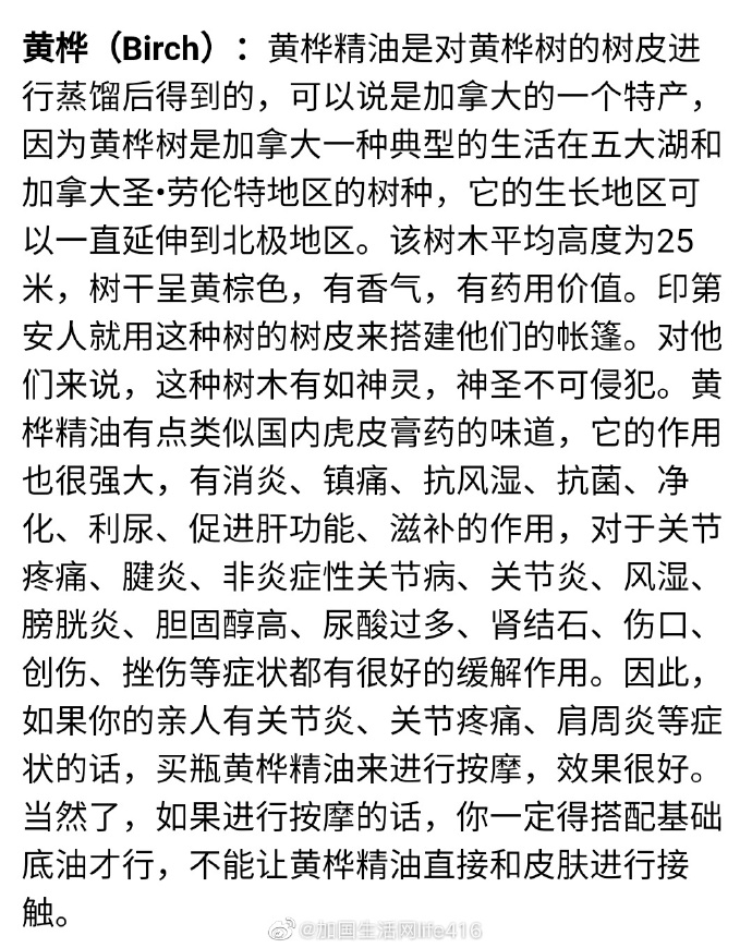 2021年2月7日:小编最近发的那条有关痛风的微博,有好多粉在问关节炎霜的问题。关节炎霜里的君臣佐使的精油中,位于君位的精油当然是Birch Sweet甜桦精油,桦树是生长在五大湖地区的树种,原住民就用桦树汁来治疗关节疼痛。看来无论是东方人还是西方人,大家利用大自然植物来治疗身体病痛的思路都是一样的!!最后上来吼一声:第67批拼邮明晚截单,过时不候哈。