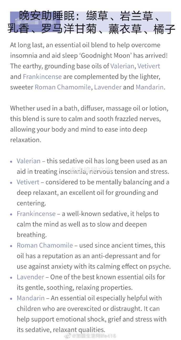 GV家还有一些有特色的复方精油,这是针对特别严重失眠的复方精油,一般睡眠不好使用薰衣草即可,但特别严重的可以试试这款复方精油,配方见上图的翻译。