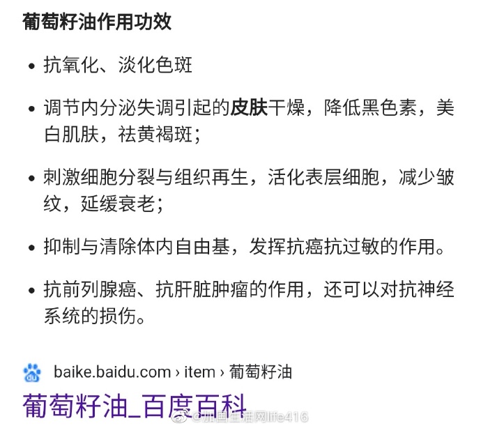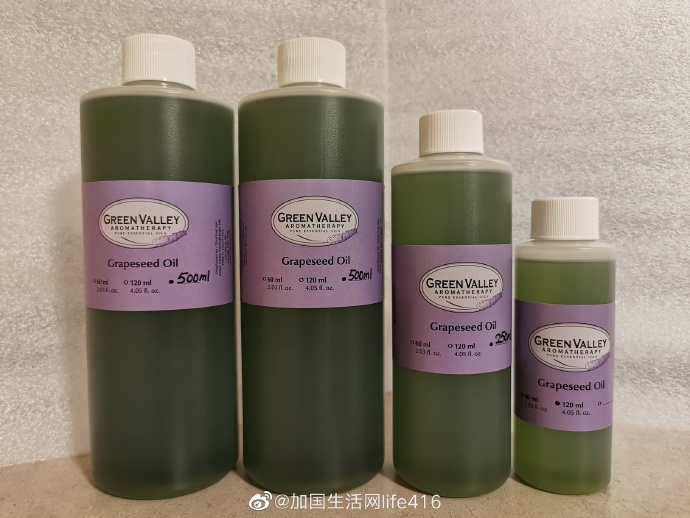 2021年2月24日:艾玛,这一片绿啊,哈哈,这是第67批拼邮大家订的葡萄籽油(内什么,小编也受上批拼邮的“勾引”订了一大瓶,哈哈)。葡萄籽油的功效是提高皮肤的抗氧化性(见图二的更多功效),让皮肤永保青春活力,可以单独做基础底油按摩皮肤,也可以混合在别的基础底油(比如荷荷巴油、杏仁油、VE等)或基础保湿霜里,再滴入精油后做按摩油或面霜。做面霜的,如果感觉面霜太油腻,还可以加入花水稀释。其实,只要原材料质量好,总能调配出一瓶适合自己皮肤的、每一种成分都知道其功效的、100%纯天然护肤品,而不是把大把银子花到了包装费、柜台费、广告费上,却还不知道具体成分的护肤品。