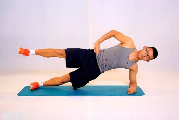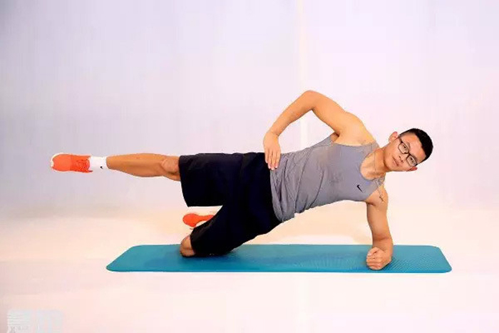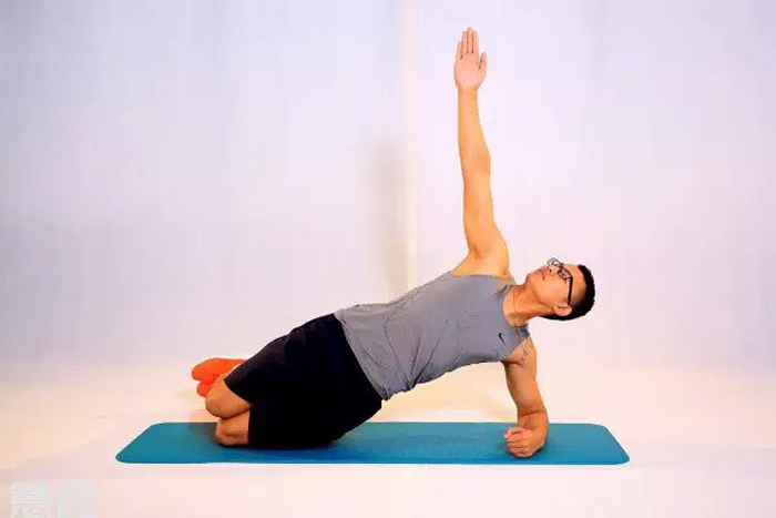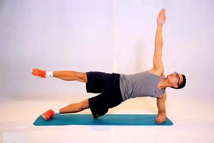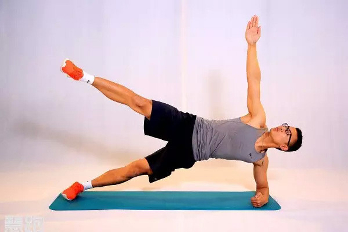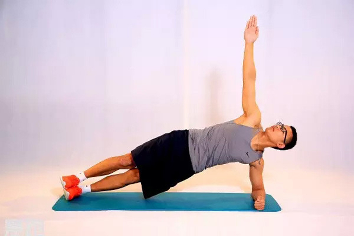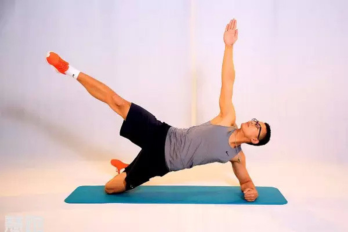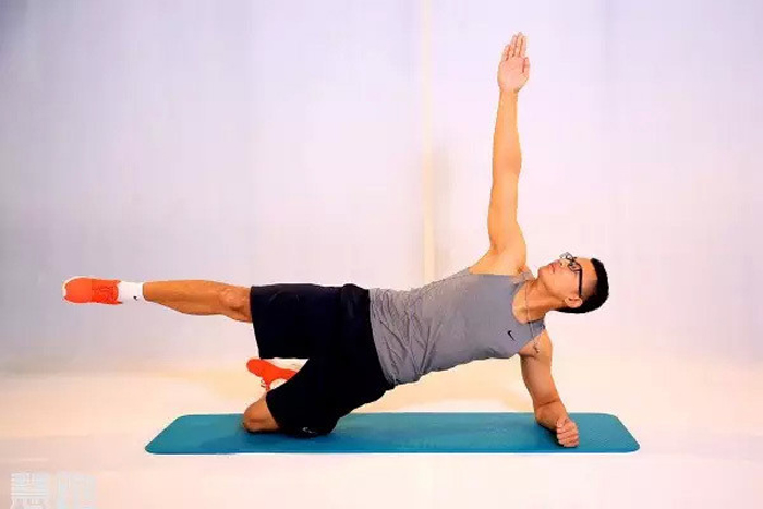 3、有抬手动作的侧桥中,手要指向正上方,注意保持躯干稳定;