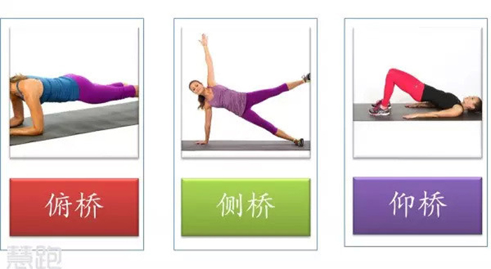 除了平板支撑外,你还需要训练躯干两侧肌肉和躯干后面的肌肉:侧桥动作可以更多训练到躯干两侧肌肉,而仰桥动作则可以更多训练到躯干后部肌肉。