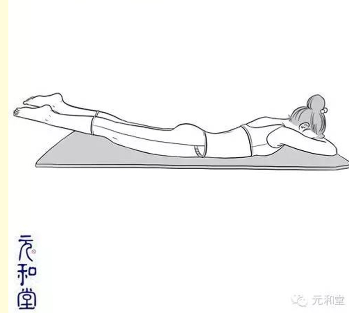 趴在地面上,两个小臂交叠在一起,把额头贴在小臂上。双脚打开一点,吸气的同时把臀部收紧。双腿伸直向上抬起来,背也轻微地抬起来一点。