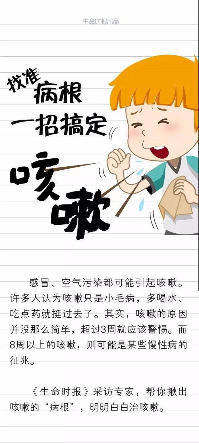 感冒、空气污染都可能引起咳嗽。许多人认为咳嗽只是小毛病,多喝水、吃点药就挺过去了。其实,咳嗽的原因并没那么简单,超过3周就应该警惕。而8周以上的咳嗽,则可能是某些慢性病的征兆。《生命时报》采访呼吸科专家,帮你揪出咳嗽病根,明明白白治咳嗽。
