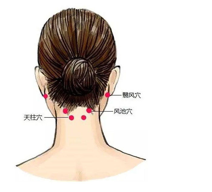 1、坐于椅子或沙发上,靠背,头稍后仰,双目微闭,消除杂念,心平气和,将两大拇指放在颈项部耳垂后凹陷处,其余四指向后并排放在脑枕部,大拇指找准天柱穴、风池穴、翳风穴,依次按压、按摩三对穴位。