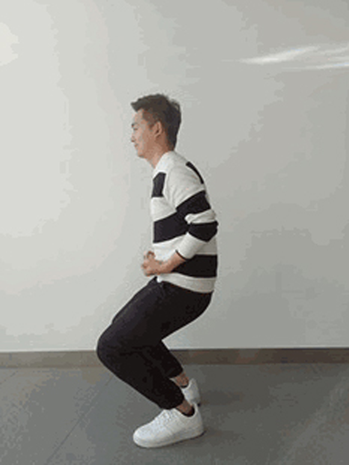 两脚分开,与肩同宽,两手由身体两侧向前合抱于腹前,位置与脐同高,两臂抱圆,同时两膝微屈,重心下沉,两膝关节微微向两旁打开,维持1~2分钟后站起,放松,再重复。