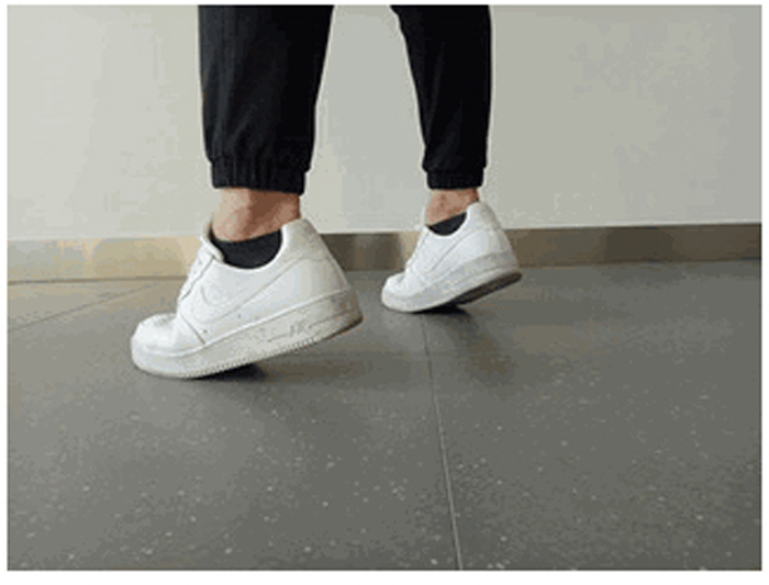 两腿并拢,提肛收腹,肩向下沉,立项竖脊,脚趾用力抓地后提起脚后跟,然后身体向下有节奏地颠动。注意身体放松,先缓缓下落一半,而后轻震地面。提踵时尽量维持10秒以上,脚跟落地时要轻柔。