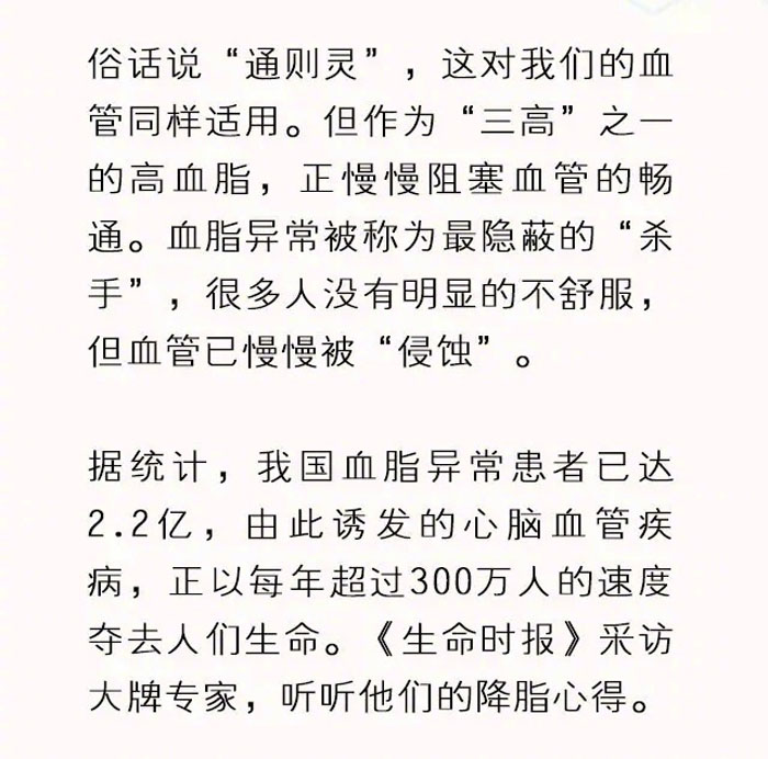 “血脂越低越好”、“血脂达标了就能停药”……生活中有关血脂的这些错误观点早已深入人心却害人不浅。我国血脂异常患者已达2.2亿,由此诱发的心脑血管疾病,正以每年超过300万人的速度夺去人们生命。《生命时报》采访大牌专家,听听权威的控脂心得。
