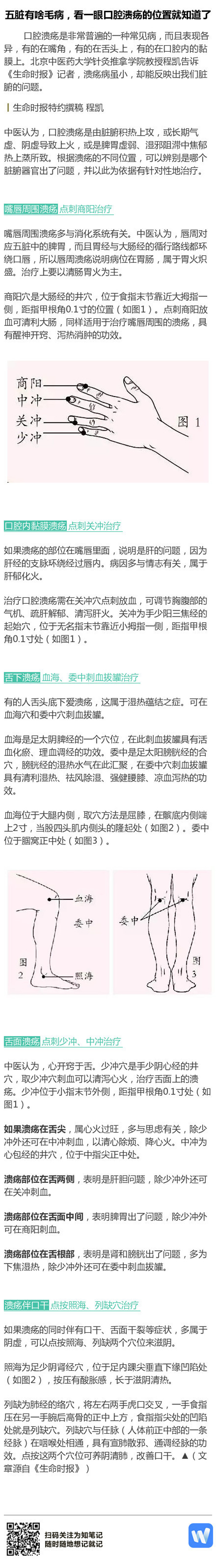 口腔溃疡是非常普遍的一种常见病,而且表现各异,有的在嘴角,有的在舌头上,有的在口腔内的黏膜上。北京中医药大学针灸推拿学院教授程凯告诉你,溃疡病虽小,却能反映出我们脏腑的问题。