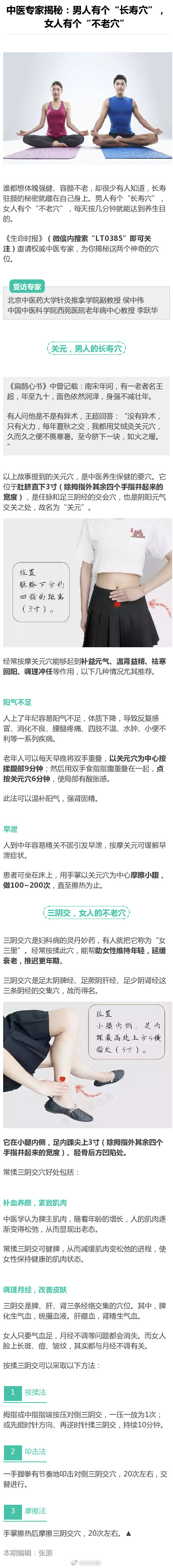 谁都想体魄强健、容颜不老,其实长寿驻颜的秘密就藏在自己身上。中医专家认为,男人有个“长寿穴”,女人有个“不老穴”,每天按几分钟,你就比别人健康。《生命时报》邀请中医专家,揭秘人体这两个神奇穴位。