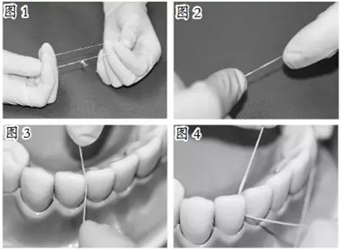 截取一段牙线,打结,形成一个圆圈(图1)。用双手持一段,约2厘米长(图2)。