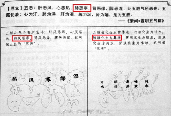 凡是后天形成的各种鼻炎,一定都是在人生的某个阶段里得了感冒后没有好好地把寒气从肺里排出来,于是一到季节变换的时候,肺就要发发脾气。那如何知道肺进了寒气了?《黄帝内经》里也说了,肺液化生为鼻涕,肺液本来是在体内流动的,但如果哪天流到体外了,即你突然流清鼻涕了,那就是肺在通知你肺里有寒气了,快想办法排寒气。但如果你继续不管不顾的话,肺也有办法,它就会启动自我保护功能:用咳嗽的方式把寒气排出来。为什么一到晚上就咳嗽得厉害,特别是在半夜3点左右?那也是因为晚上寒气重,进入肺的寒气也多,同时半夜3-5点是肺经开始工作的时段,肺更要努力工作,不受你的意识控制。