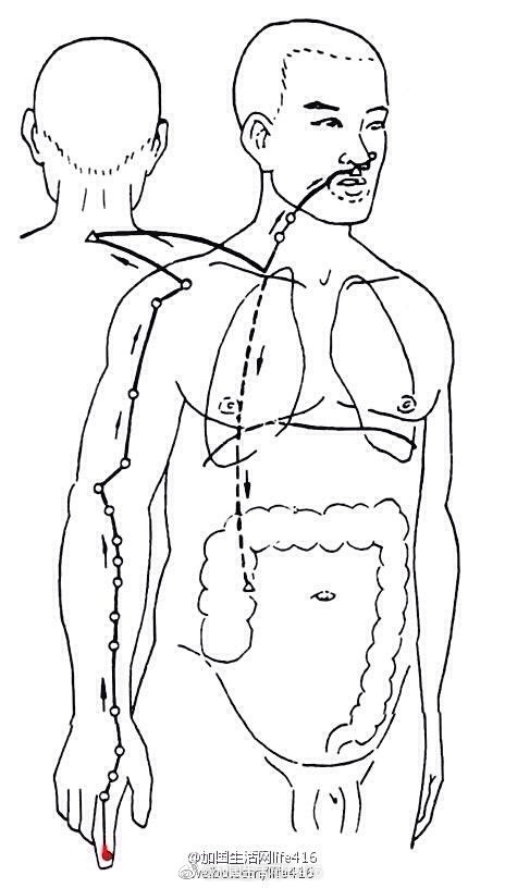 图一在养肺篇(3)曾发过,如果你仔细看图的话,就会发现在手臂上经过的肺经除了经过大椎穴外,还在身体内部和大肠相通,故中医还有“肺和大肠相表里”之说。有些人得了感冒,前期是发烧咳嗽,后期是拉肚子,就是这个原因。