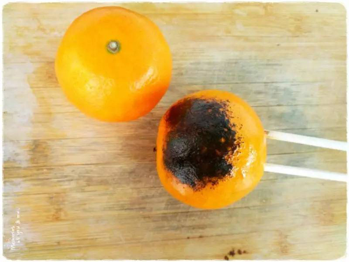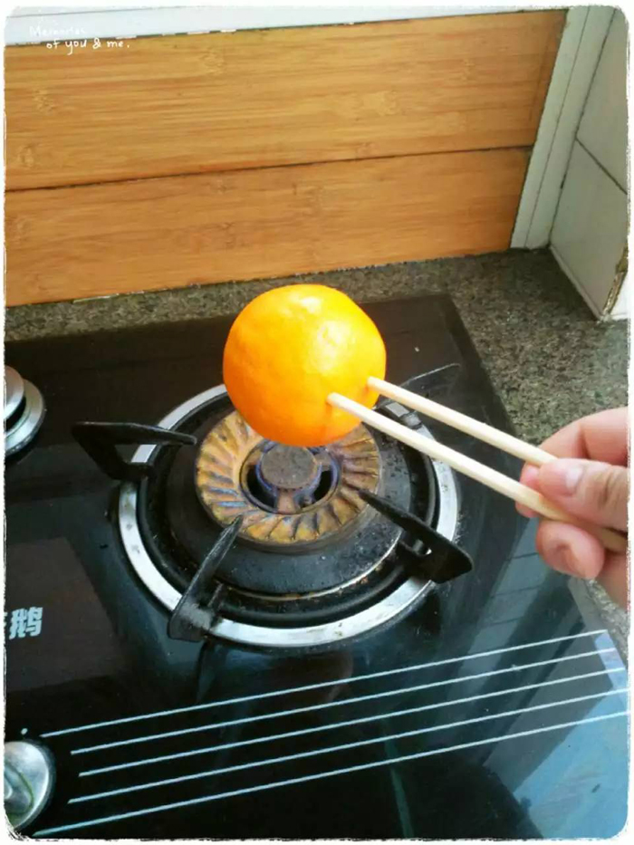 用筷子把橘子固定。这样烤起来不烫手呀不烫手。