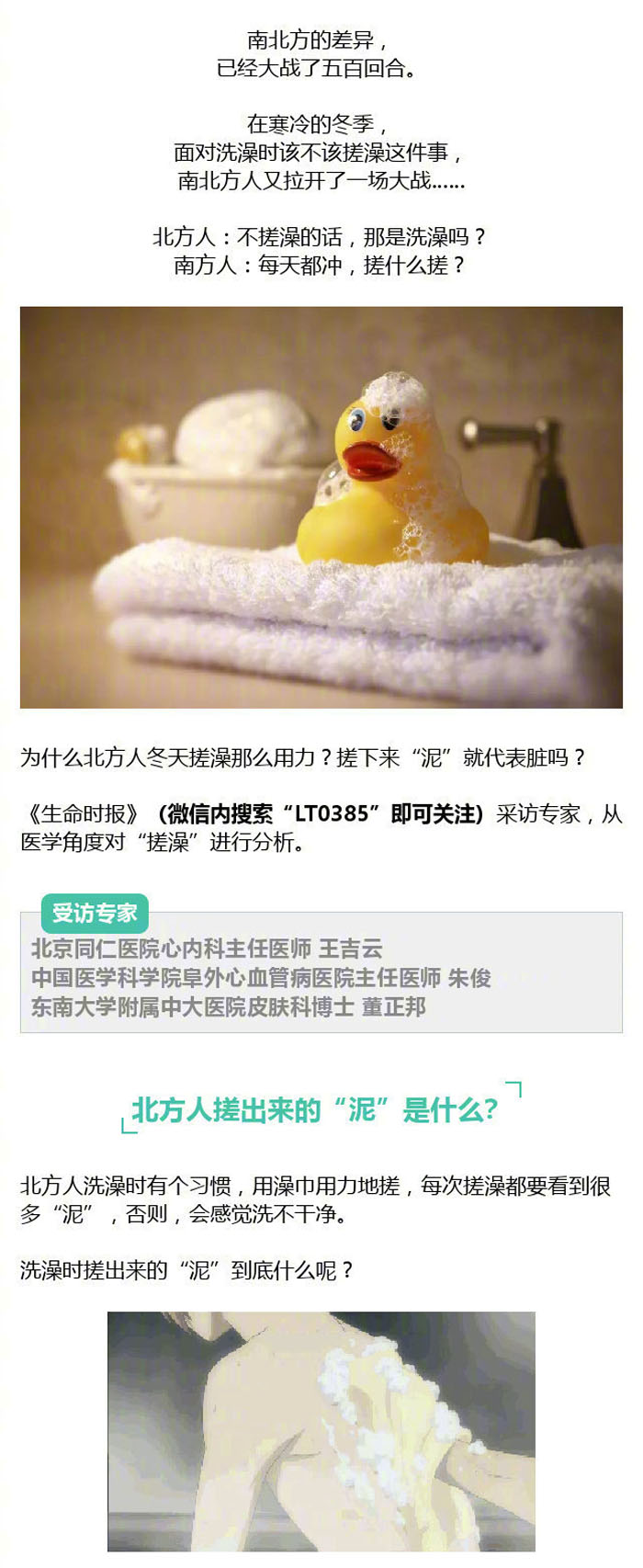北方人洗澡时有个习惯,用澡巾用力地搓,每次搓澡都要看到很多“泥”,否则,会感觉洗不干净,而南方人洗澡时只是“冲冲”而已。事实上,这层“泥”是人们每天新陈代谢产生的脱落细胞及身体分泌的油脂等。生命君邀请专家,帮你从医学角度对“搓澡”进行分析。