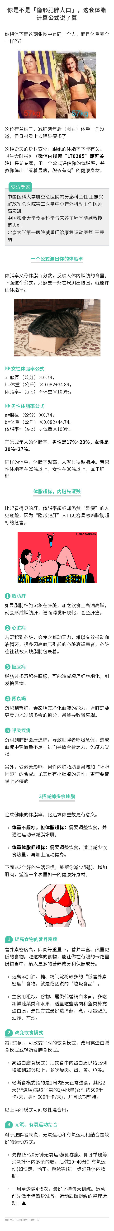 追求健康的“体脂率”,比追求体重数更有意义。比起看得见的胖,体脂率超标却仍然“显瘦”的人更危险,因为“隐形肥胖”人口更容易忽略脂肪超标的危害。下面这个公式,只需要一条卷尺,就能评估体脂率。