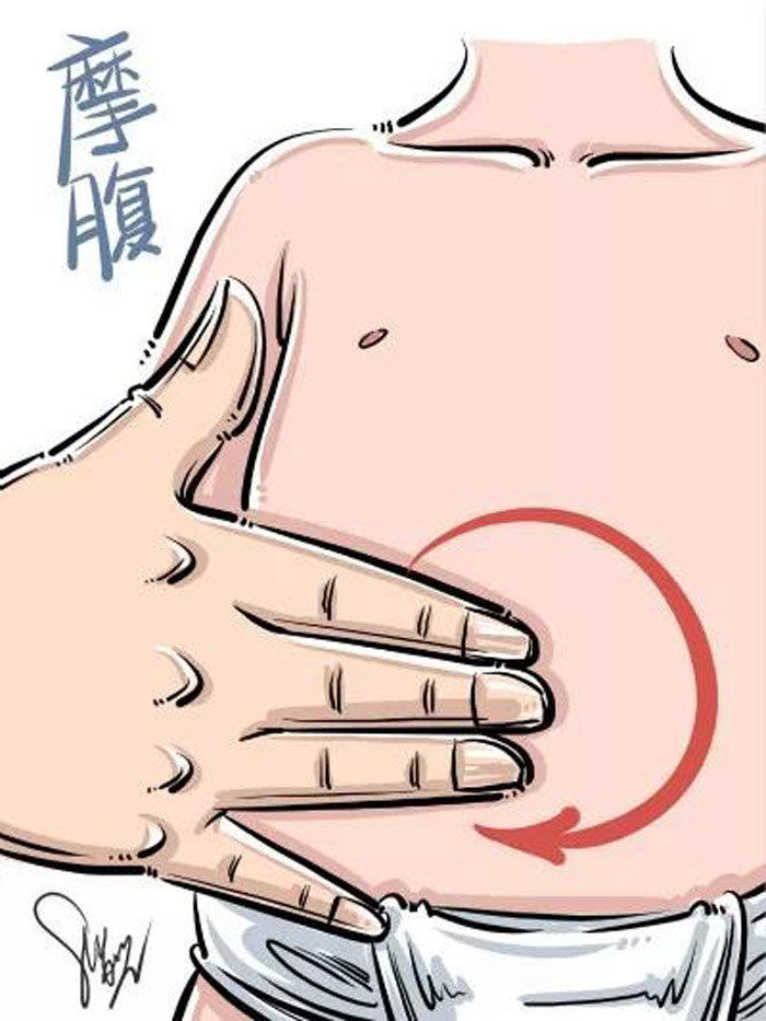 让宝宝仰卧,用手掌,呈顺时针方向按摩,轻轻带动皮下的肉肉,可以促进胃肠蠕动,操作3-5分钟。