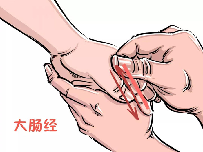 大肠这个穴位,位于食指桡侧缘(指尖到指根呈一条直线),赤白肉际处。向指尖方向直推为清,向虎口方向直推为补,来回推为清补,操作3分钟。