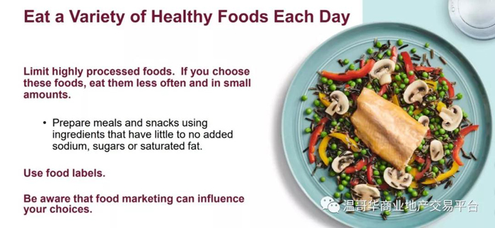 蔬菜,水果,全谷物,和蛋白质应该经常摄入。其中蛋白质应更多地从植物类食品(plant-based) 摄取。这一点和以往提倡从牛奶和肉类摄取蛋白质有很大的不同。;