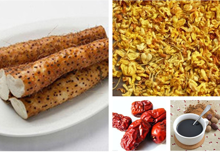 原料:新鲜山药200克,桂花15 克,粳米50克,大枣5枚,红糖 10克。