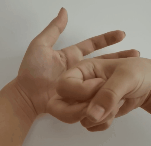捣小天心,开郁散结,解痉镇咳。家长一只手固定住宝宝的左手,露出做左手掌根,家长另一只手弯曲,用食指或者中指弯曲的指关节面捣在大鱼际肌和小鱼际肌交接处的凹陷中。