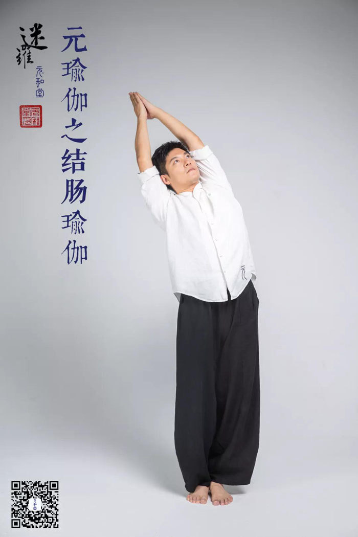 1、首先是“摩天式”:双腿并拢直立,双手交叉,转动手腕,手心向上把手臂伸直过头顶,呼吸5次。