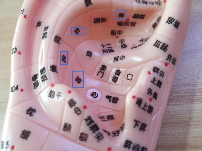 肾,在对耳轮下脚下方后部。AB线前半段的上方,对耳轮下脚分成三等份,后三分之二和AB线之间分成前后两等份,后半分就是肾。