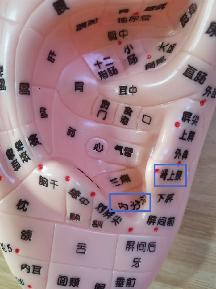 肾上腺,耳屏外侧面分为上下2等份,上部是耳屏1区,下部是耳屏2区,肾上腺在2区游离缘的尖端。