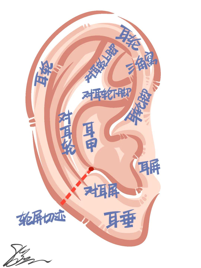 风溪,耳舟自上到下分为6等份,依次为1~6区,1区和2区的交界就是风溪。