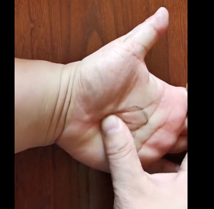 按照图片所标部位的曲线方向,在拇指处(拇指呈弯曲状)推500下,之后在手心推300下,以祛湿和散邪。