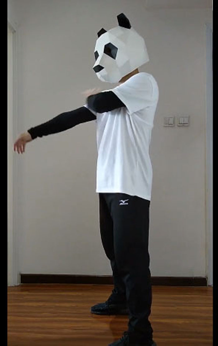 2、伸直左臂,拇指冲上,用右手掌从肩头一直推到拇指处。